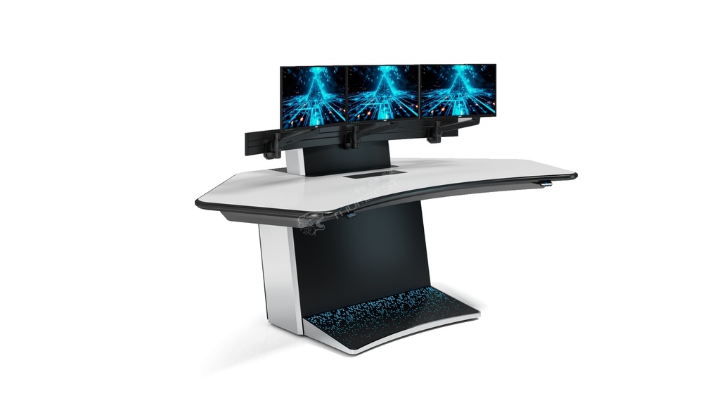桌面采用平滑的弧形过渡,搭配极具科技感的支撑底座,整体视觉上简洁且富有未来感,符合现代指挥中心、数据中心的审美